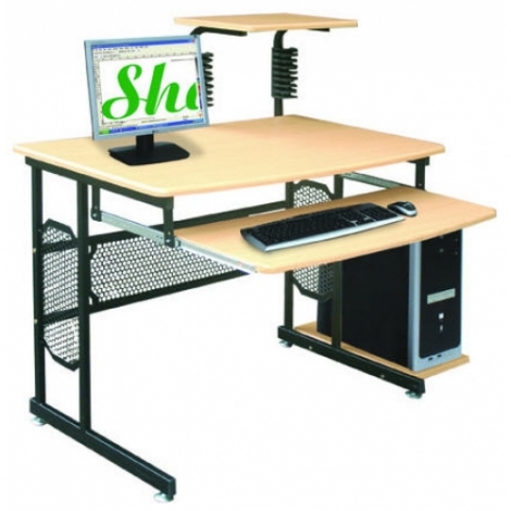 Bàn vi tính khung thép sơn tĩnh điện, mặt gỗ ép chân không. Bàn có thêm giá để máy in hoặc máy fax.